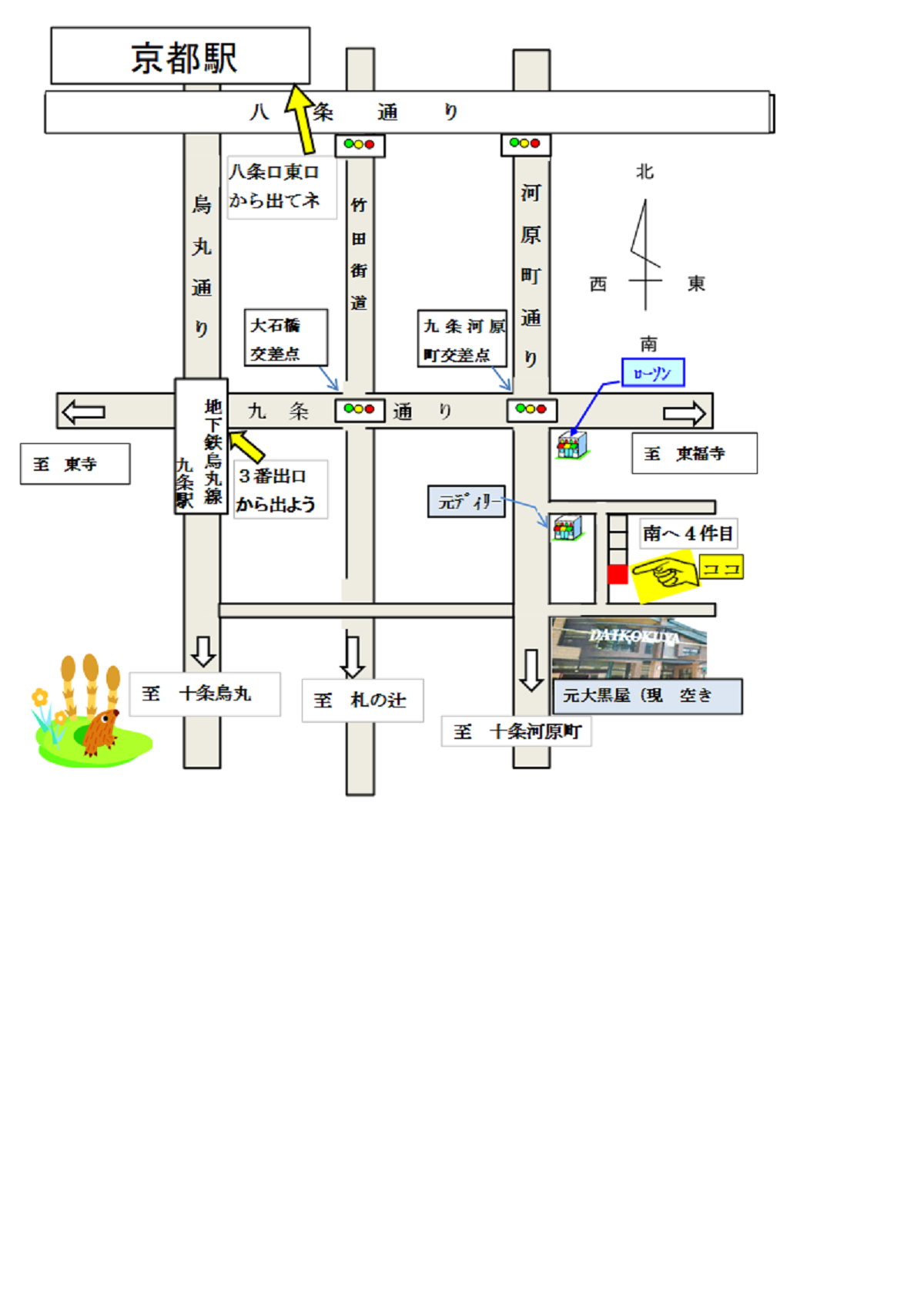 周辺地図 アクセス 電車の場合: 九条河原町南東角下がる東入る(大黒屋1つ手前通り)すぐ南下がる4軒目東 ・京阪「東福寺駅」より徒歩約10分 ・地下鉄「九条駅」より徒歩約6分 ・JR「京都駅」より徒歩約10分